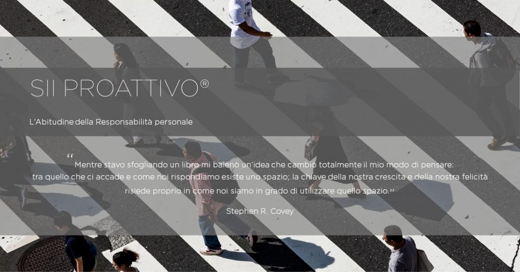 Le persone proattive capiscono che, poiché si è liberi di scegliere, si è responsabili della propria vita. Quando hai un atteggiamento proattivo nei confronti della vita, prendi decisioni intenzionali basate sui valori che ti appartengono e ti concentri sulla tua Sfera di Influenza®; ciò significa che impieghi la maggior parte del tuo tempo e delle tue energie su fattori che puoi effettivamente controllare o influenzare: salute, bambini, problemi a lavoro.